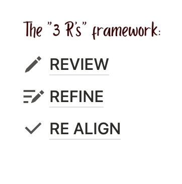 Inside, you’ll use the 3 R’s framework (Review, Refine, Realign) to reflect on where you’ve been and get clear on where you’re going, without pressure or burnout.