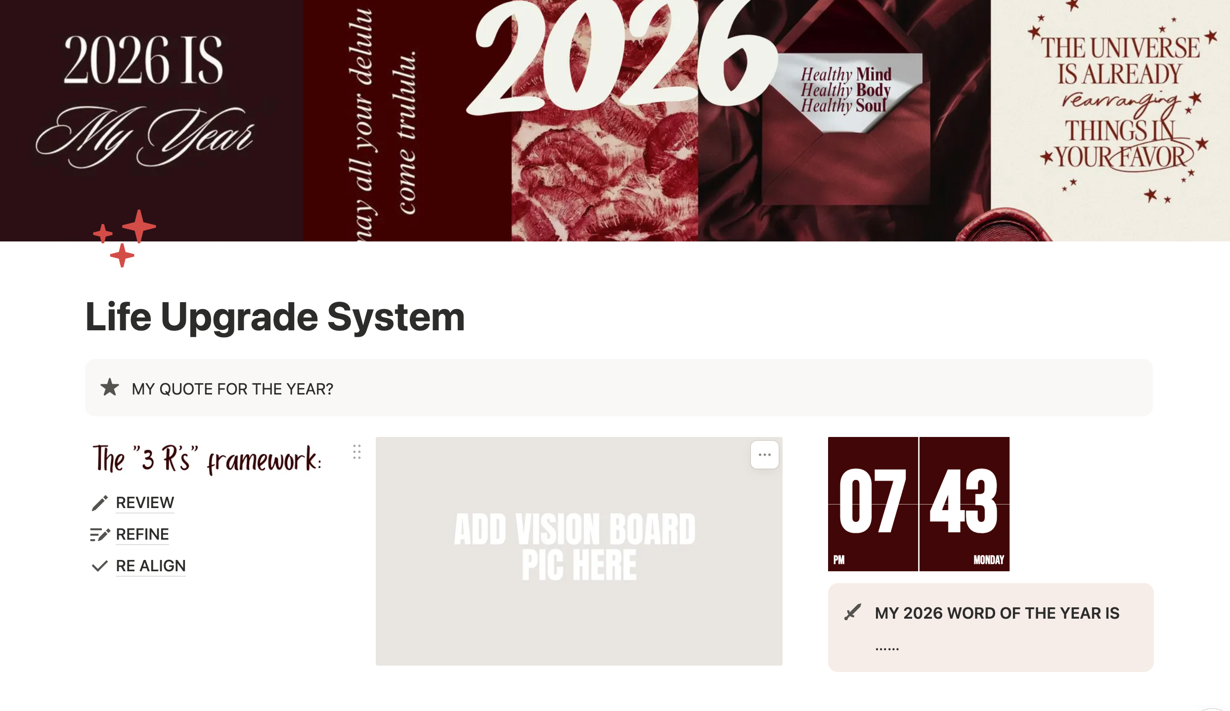 Life Upgrade System is a Notion template designed to help you intentionally plan your year, realign your goals, and step into your future self through reflection, routines, and quarterly focus.